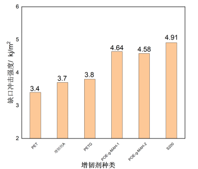我們通過實驗得出,在與市面上其他幾種類型的PET增韌劑相比,添加5%比例的S200到PET料中,缺口沖擊強度可從3.4kj/m2提高到4.91kj/m2,抗沖擊強度提升44%,增韌效果最佳。